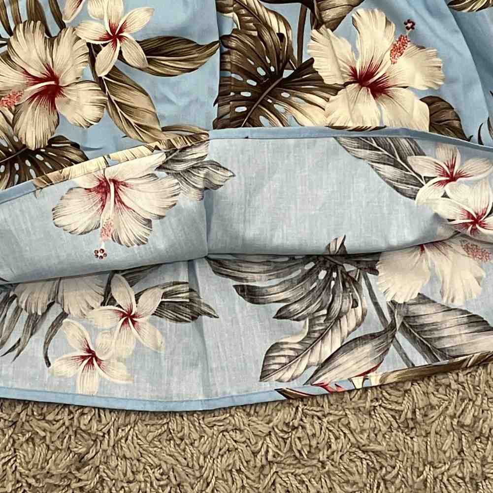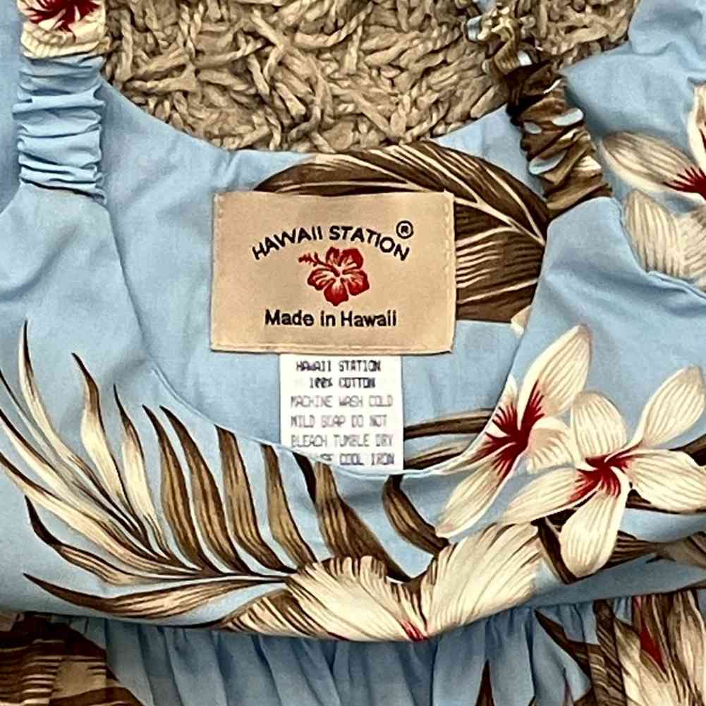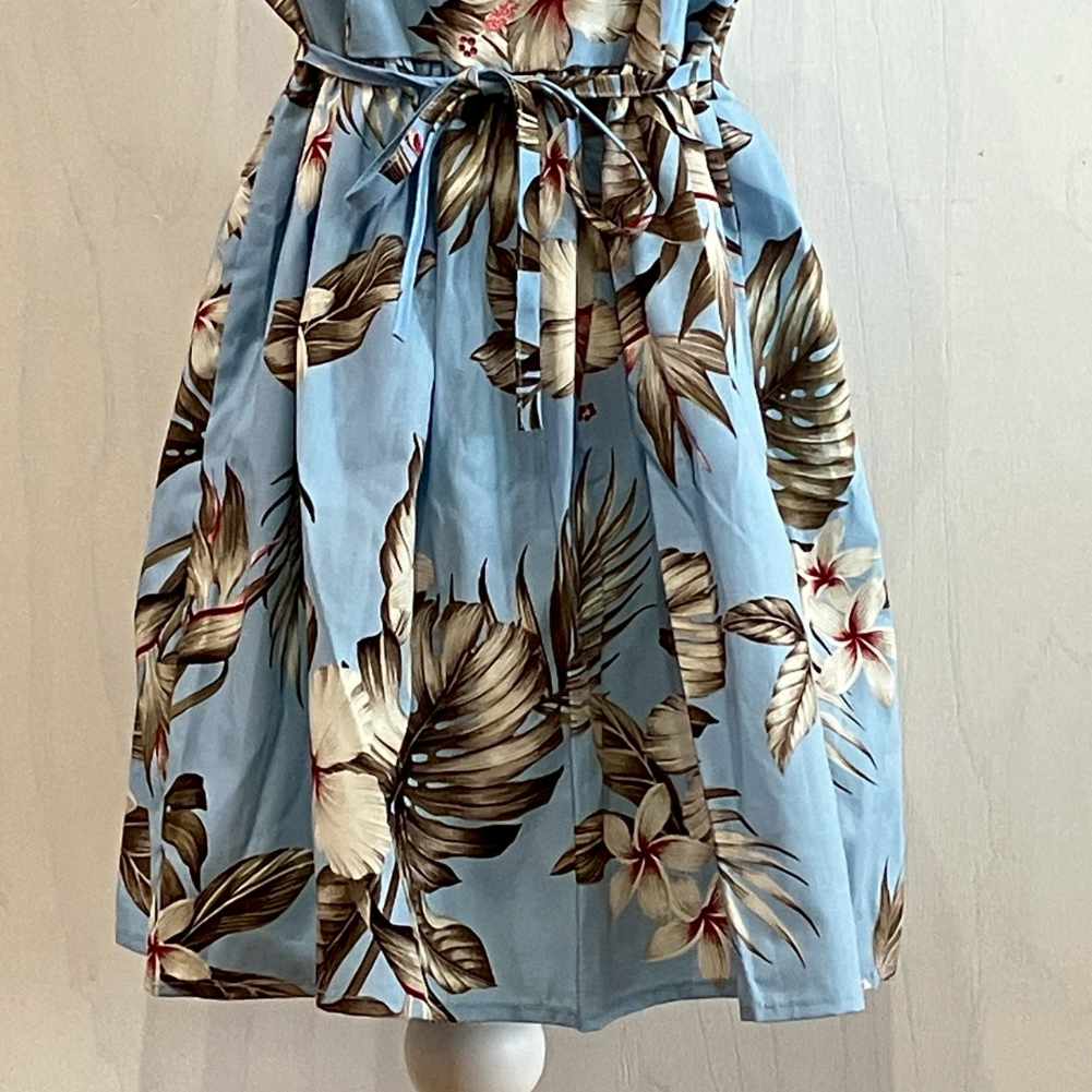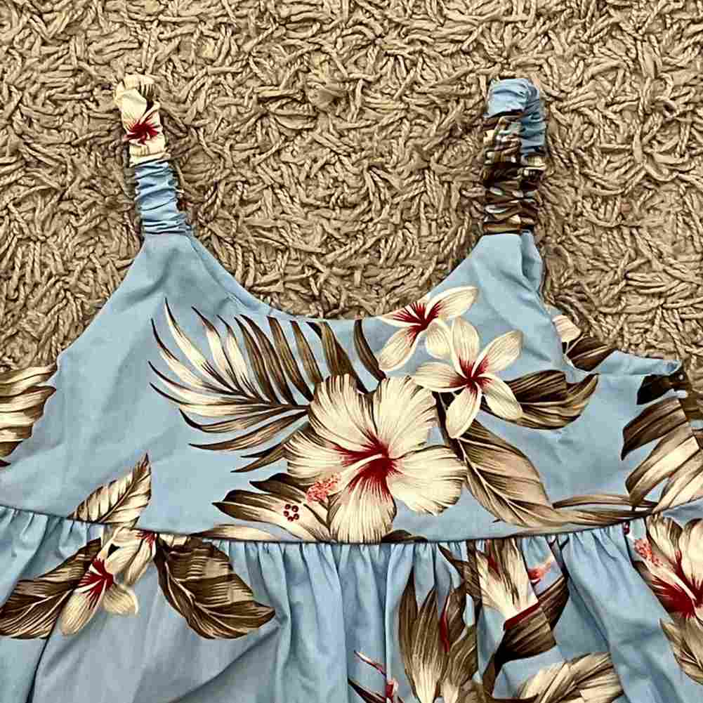 夏らしいライトブルーのベースに、大きなハイビスカスとトロピカルリーフをあしらったハワイアン柄のキッズワンピースです。