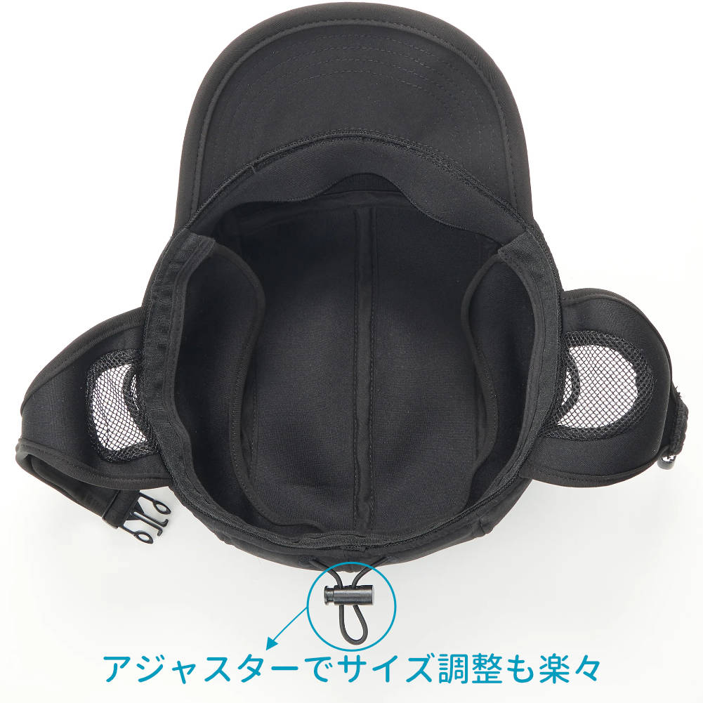 表地は撥水加工素材で、収納可能な耳当て付き。