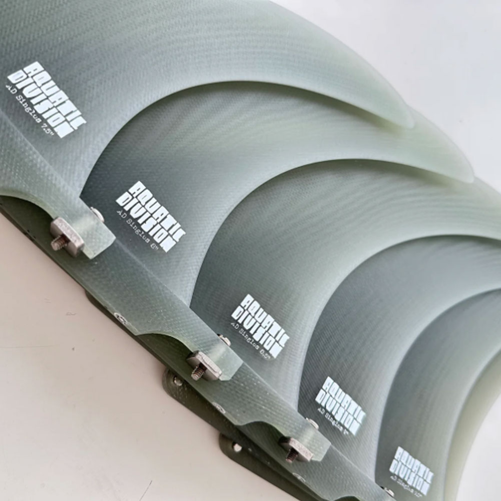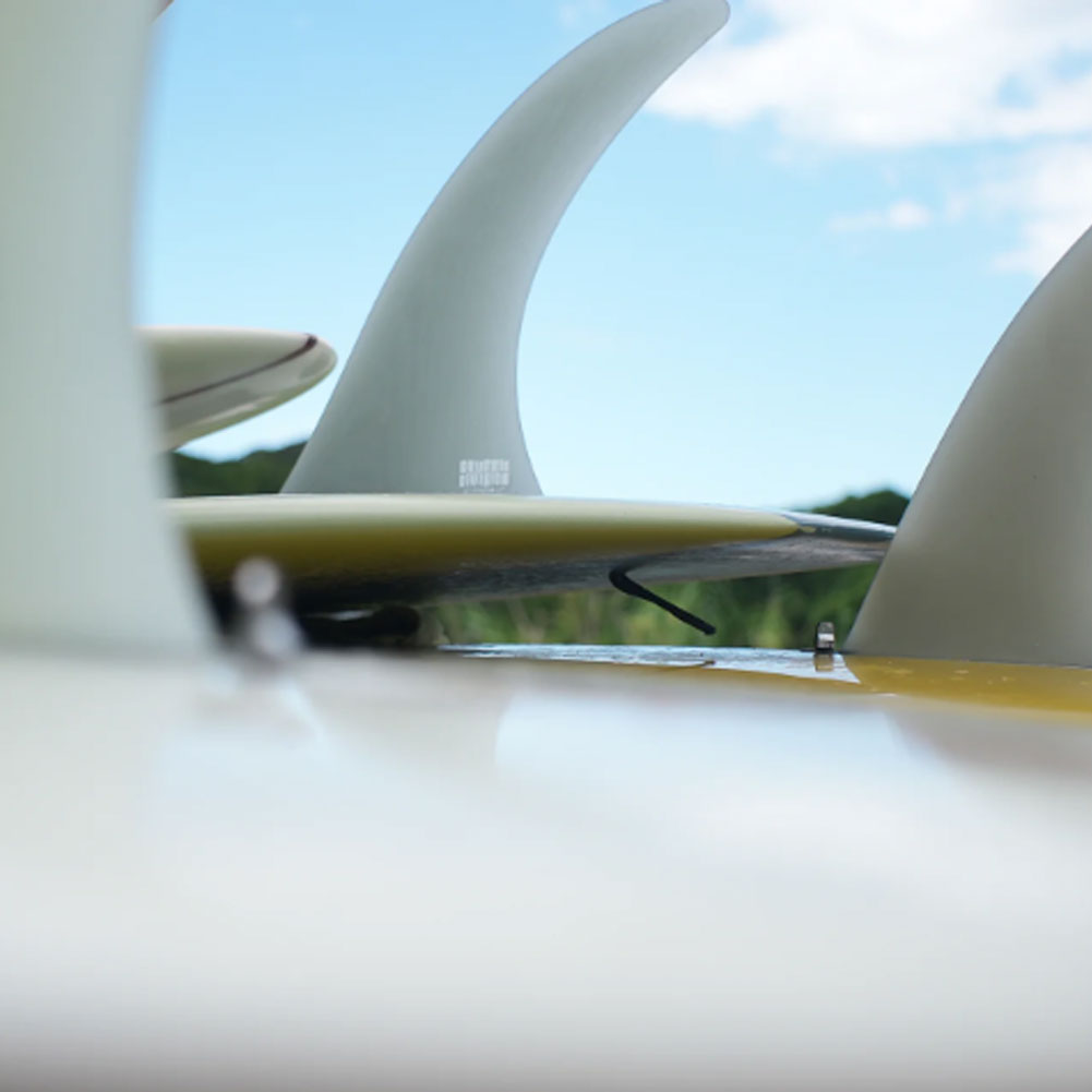 グラスファイバー製のフィンはサーフボードにも使われているクロスを積層し、レジンで固めた後に型を切り抜き、1本1本ハンドメイドでサンディングして仕上げています。