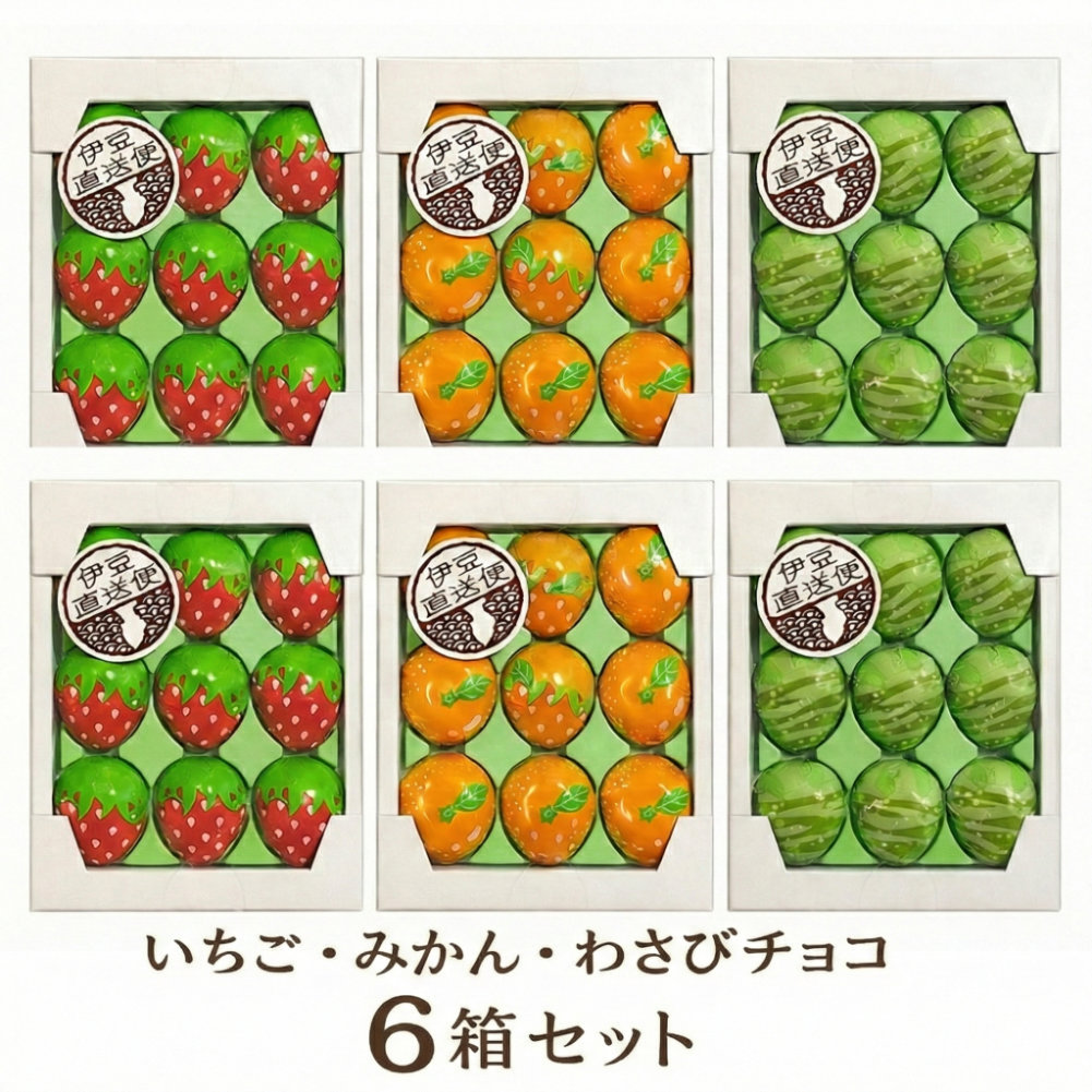 伊豆の名産素材をイメージしたいちご・みかん・わさびチョコレートを一度に楽しめる、人気フレーバー6箱セットです。