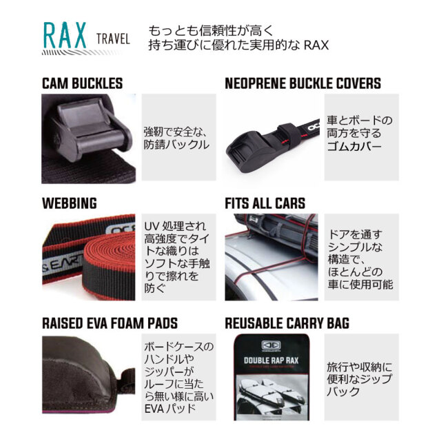 簡易ルーフ・キャリアの決定版!OCEAN & EARTH のラップラックス!誰でも簡単設置で、キャリアのない車でもサーフボードを積載できます使いやすさ、設置の簡単さが魅力。もちろん信頼性も◎のルーフキャリアです! 【使用方法】 ・前後2本、車の室内を通してルーフ上で閉めるだけの簡単設置。 【仕様】 ・1本~4本のショートボード、又は2本のロングボードなど(ボードの積載数は使用状況によって異なります)・高品質のRAX ・防錆金属のバックルロックを保護するネオプレーンパッド ・UV処理を施したストラップ ・空気力学を取り入れた高いEVAモールドパッド ・ワックスがたまりにくいPVCトップパネル ・収納ケース付