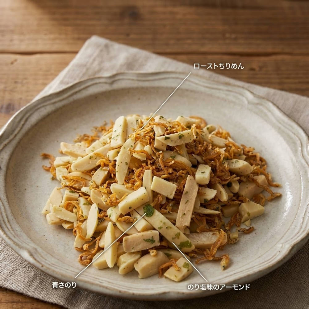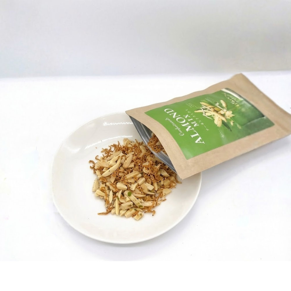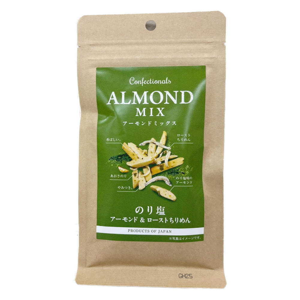 香ばしくローストしたアーモンドに磯の風味豊かなあおさのりと塩で味付けし、カリッとしたローストした静岡県産のちりめんをブレンドしました。