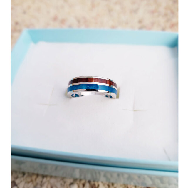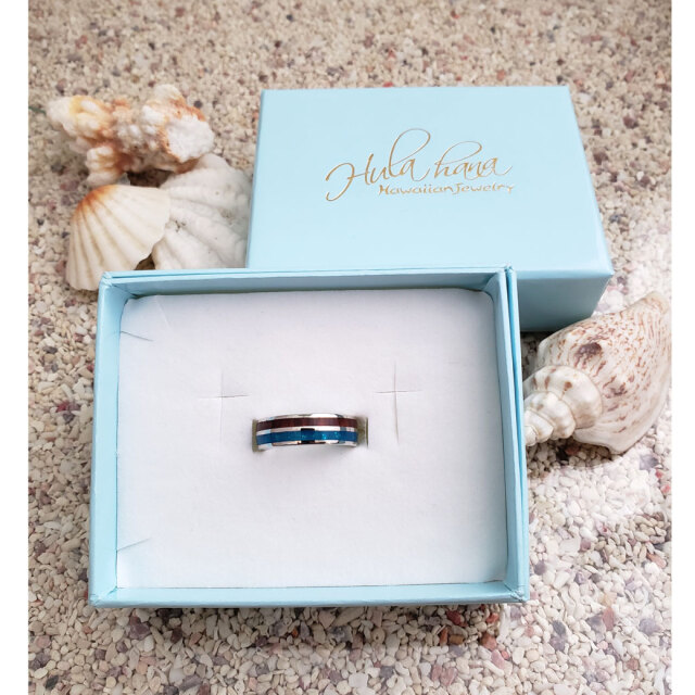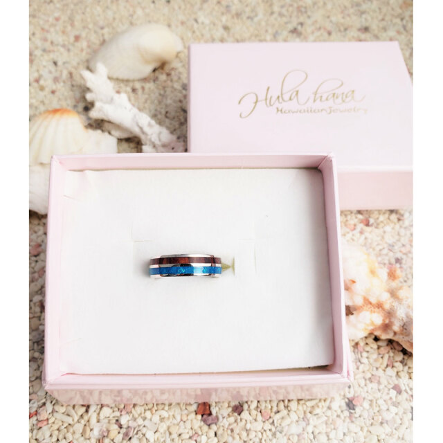 ハワイの宝物として古来より珍重されてきたコアウッド。 ハワイでは不思議な力が宿る「聖なる木」と呼ばれ、その浮き出るトラの模様のような木目は神が宿るといわれ、王族のみ使用できたとも言われています。人気のコアウッドと鮮やかなブルーオパールの2本のラインが、目を惹きます。外した時に見える内側も、波型に透けていてハワイの魅力が凝縮されたリングです。