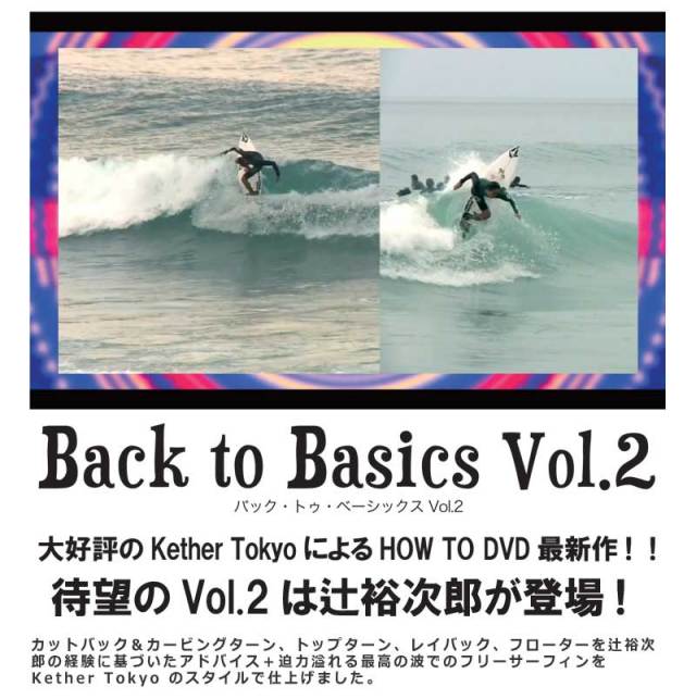 Back to Basics Vol.2 はカットバック&カービングターン、トップターン、レイバック、フローターを辻裕次郎の経験に基づいたアドバイス+迫力溢れる最高の波でのフリーサーフィンをKether Tokyo のスタイルで仕上げました。 昨年のコンテスト期間の合間にスケジュールを合わせ撮影日数は、なんと1週間あまり!なぜか、撮影日の波のコンディションは全てにおいて100 点!と言 いたくなる様な素晴らしい波でした!!!もちろん今回も撮影、編集、曲、デザイン全てがKether Tokyo オリジナルとなっています。 サーフィンの上達の為に是非お役立て下さい!