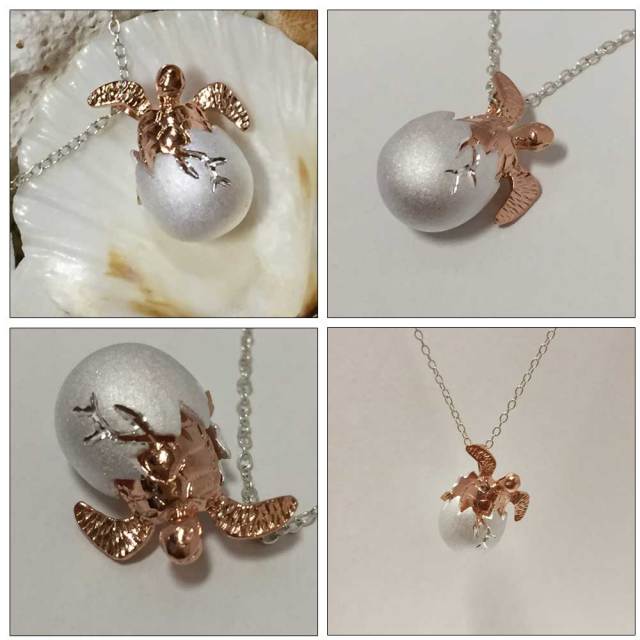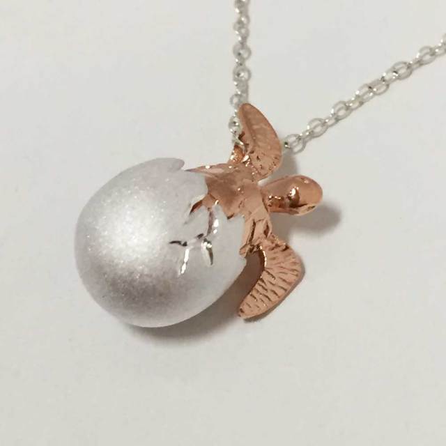 ウミガメのことをハワイ語でhonuといい、神聖な生き物として神様からの使い、幸運を運んでくれる”海の守り神”として敬愛されてきました。柔らかい曲線のタマゴの中から産まれたての赤ちゃんホヌがキュートで、表面にタマゴのひび割れまで細かく細工がしてあります。