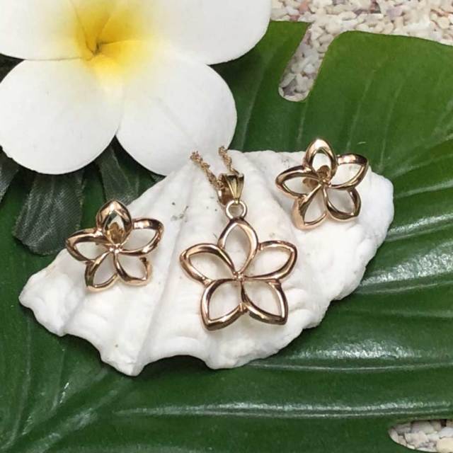ハワイアンジュエリー 14k シンガポールチェーン付き透かしプルメリア キャッチピアスネックレスセット/ハワイアンアクセサリー