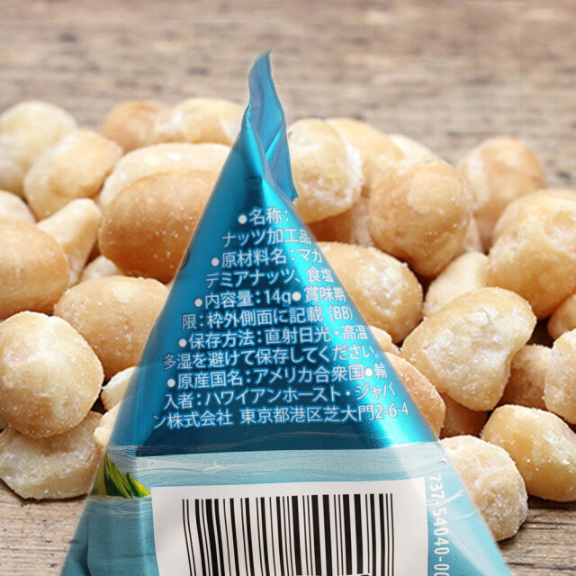 10日間じっくりドライし香ばしくローストしたマカデミアナッツのトライアングルミニパック。