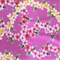プルメリアのレイがいっぱいに広がる総柄ハワイアン生地です。明るいピンク地にハワイを代表する花のレイがたなびき、華やかな気分になることまちがいなし!