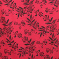 鮮やかなワインレッドの生地にブラック単色でハイビスカス柄がプリントされている、 大人っぽいデザイン。フラの衣装やパウスカートなdpにもおすすめの素敵なデザインです。