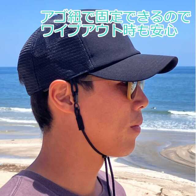 後部がメッシュになっているので水抜けもよく、アジャスター付きのアゴ紐で、ワイプアウト時も流されない。