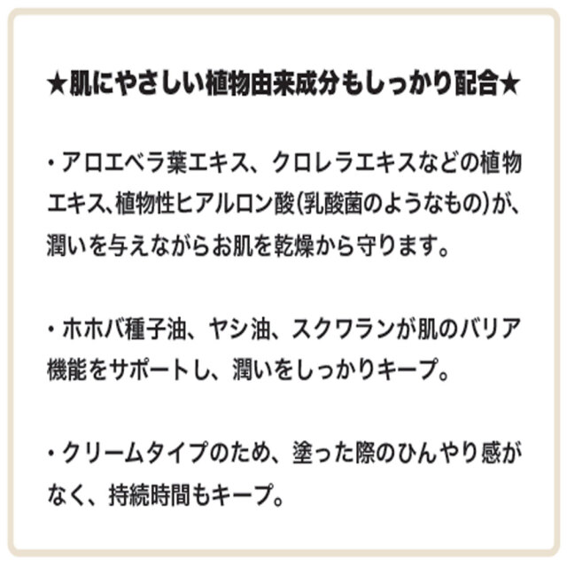 ・アロエベラ葉エキス、クロレラエキスなどの植物エキス、植物性ヒアルロン酸(乳酸菌のようなもの)が、潤いを与えながらお肌を乾燥から守ります。