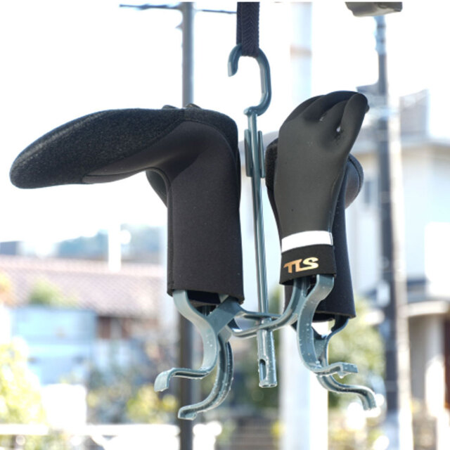 冬サーフィンの必需品であるサーフブーツやグローブなどの小物を干すことができるハンガー。