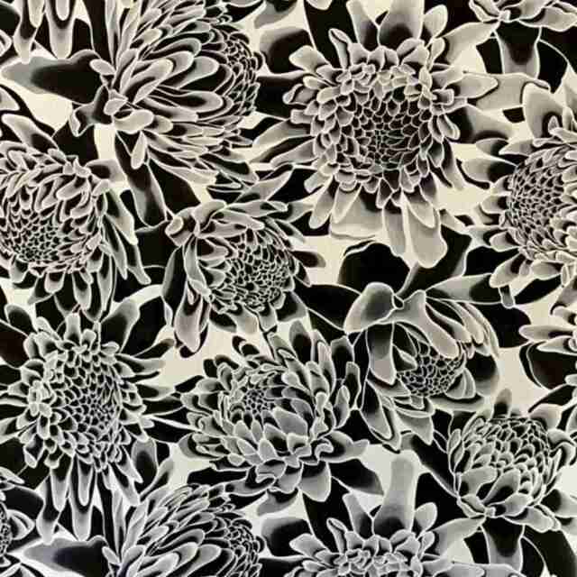 白黒のトーチジンジャーが幻想的に描かれ、夜をイメージさせる大人向けの総柄ハワイアン生地です。