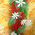 レッド・イエロー・グリーンのグラデーションに、白いプルメリアとリーフ模様が映える、南国ムードたっぷりのハワイアン生地。