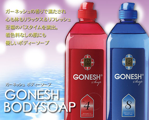 香りを身にまとった様な残香感を楽しめる、賦香率にこだわったボディソープです。 浴室で使用中はもちろん、お風呂上りの体から残香感を楽しめるほど高い続香率!ボディータオルにもGONESHの香りが残り、翌日のバスタイムにもGONESHの香りで満たされる浴室で、さらに安らぎのひと時を演出してくらます。弱酸性で着色料を使用していないので、肌に優しいボディーソープです。パッケージもお洒落で、バスルームをお洒落に演出してくれます。【香りタイプ】