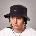 サーフィン中、ハットを流さないように、耳上にネックバンドと顎紐がついた水陸両用ハット。