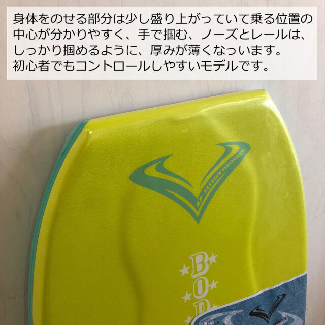 『ボディーボードを始める人が使いやすい板を』 をテーマにくせのないアウトラインと握りやすいハーフコンツアードも付いた高級感のあるビギナーモデル。